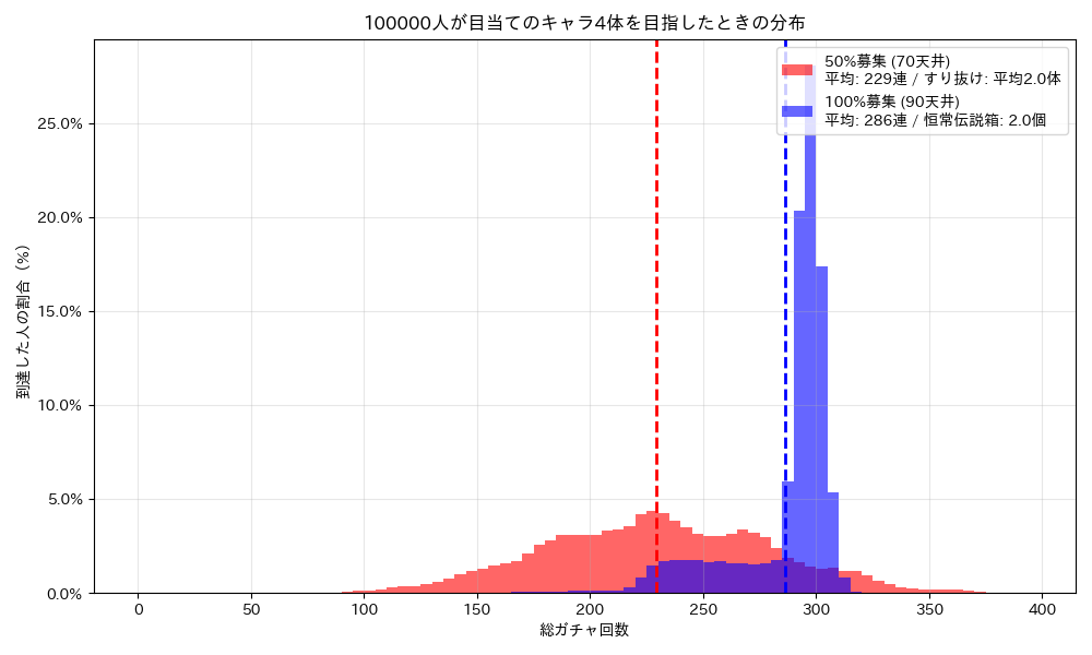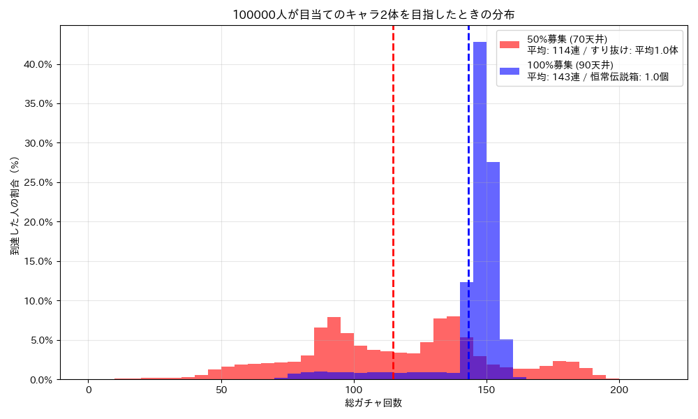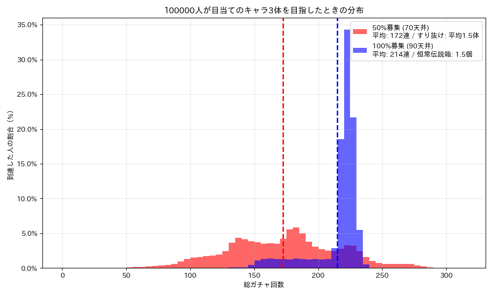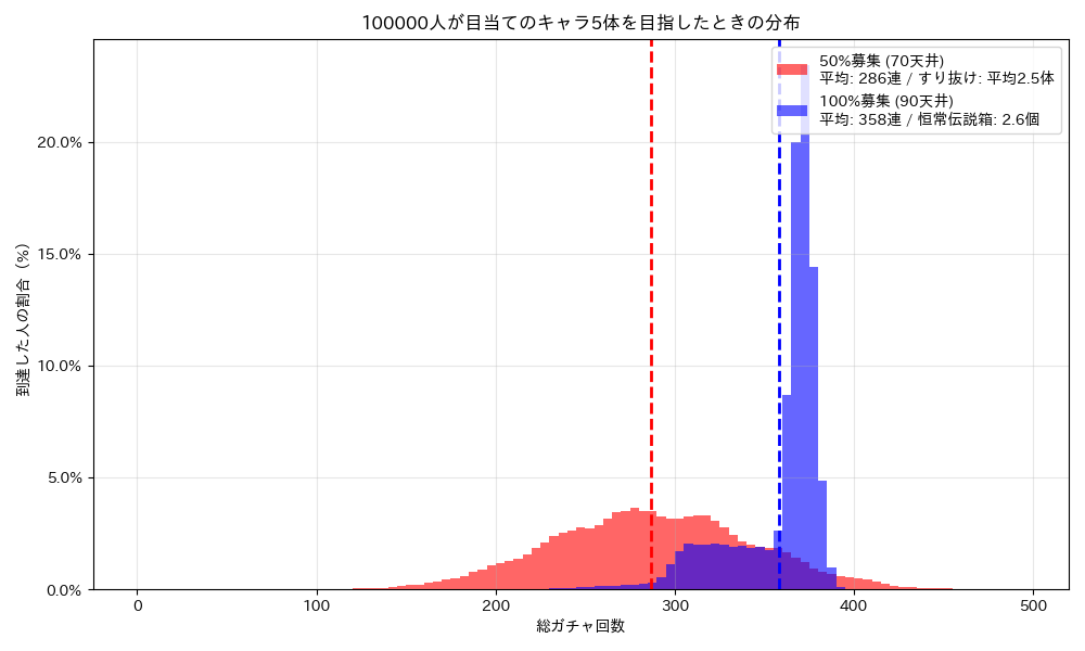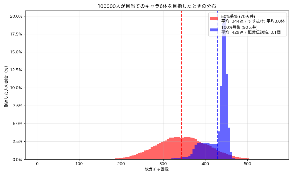 まずは「10万人のプレイヤーが、完凸(6体)するまでガチャを引き続けた結果」をシミュレーションしたグラフをご覧ください。