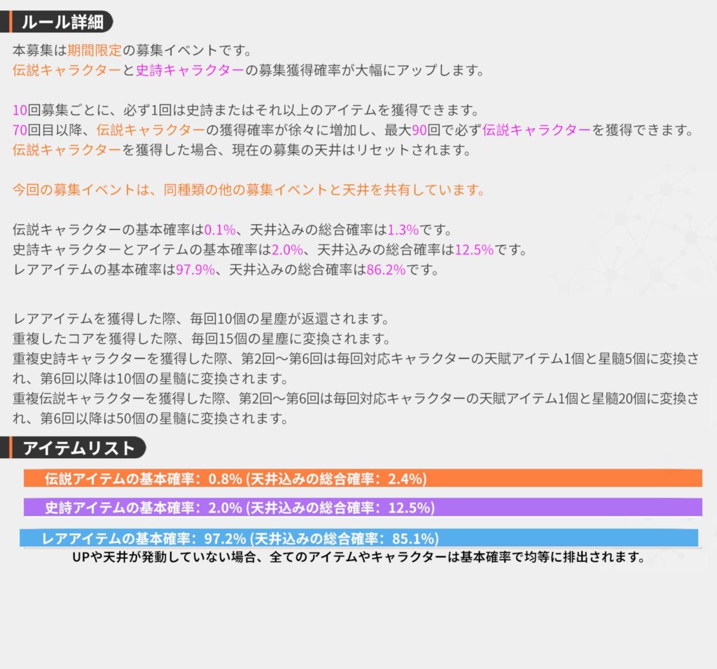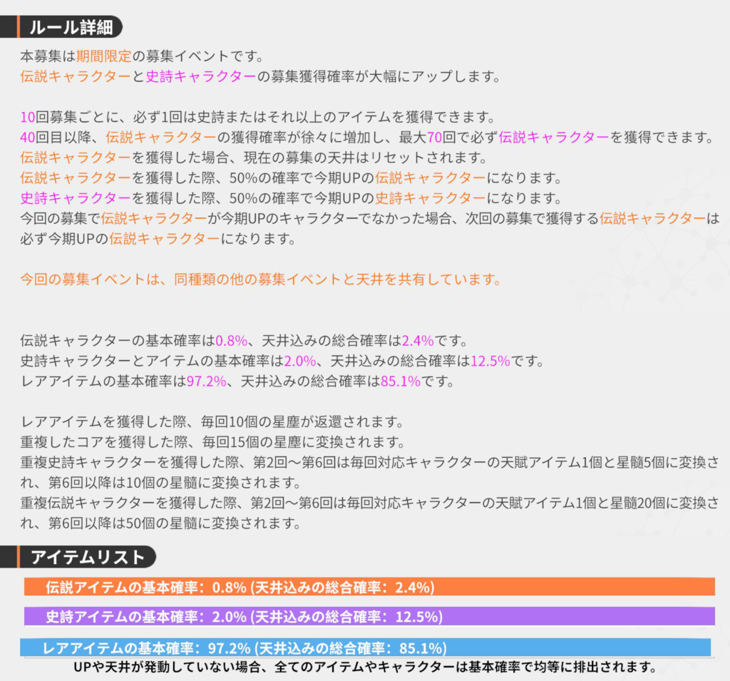 - すり抜け: SSRが目当てのキャラでない場合、次のSSRは必ず目当てのキャラ(確定)。